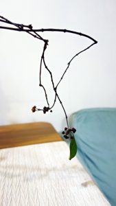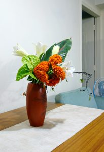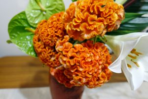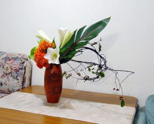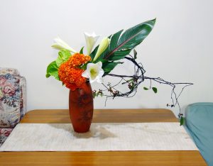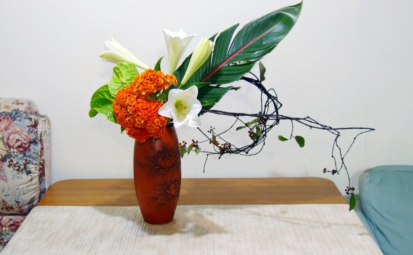 【濃豔對秋光】習作課罷,花材靜置水桶,二日不曾聞問,直到花仙子飄翎而來,靈感乍現,取來朱泥刻花老件,鐵炮百合芳郁幽遠,黑藤子彎折與天堂鳥葉撕開的葉脈透著空間感,雞冠花橘朵豐華相映,一枝濃豔對秋光,型態豐斐,頗為自然,不禁心寬意和,日日賞花喜之不勝。