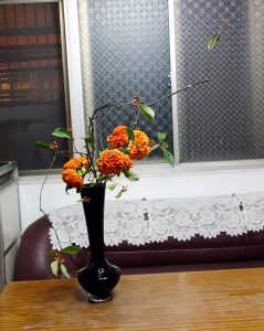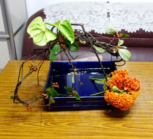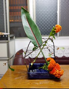 【豐橘褶朵雞冠花】夏季常見的雞冠花,以大紅色和胭脂色最常見,有雞冠花就有圓仔花,農曆盛夏難以忘懷的鄉野記憶。台灣育種技術和花卉行銷直追荷蘭,重瓣豐碩艷橘雞冠花,立冬之際增色三分,黑藤子彎折塑形或自然枝條延展各有風情,加上一片天堂鳥葉,變化三款型態花形。四方水盆花器裡以張力和結構插穩花腳,老師不准我們練習時用橡皮筋或鐵線絲綁缚,為的是無劍山扎實的基本功底,大作小品皆游刃有餘。 On 2017-11-09