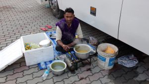 【清晨的早餐路邊攤】飯店旁一位男子席地而坐,大巴士旁,安然自若 地煮咖哩飯,大概是給司機們的早餐路邊攤,晨光下自食其力的庶民一景。 印度無處不在的男女老幼乞兒百態,深刻地讓我看見人性,選擇不只是意願,也是一種能力。我並不貶低乞兒的乞食,當無情的逼迫性現前,隨業流轉的因習,有時如羅網罩下,一時無處可逃。男子安然自若的自食其力一景,是我照見了甚麼? @印度尼泊爾朝聖行-2 On 2017-12-05