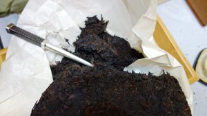 普洱老陳茶,在1970-80,甚至90年初期,常見裸磚裸餅,試茶憑經驗和真本事。中國2006年起制茶才訂標章,早年老茶,有些裸裝上陣,老茶當年只重茶菁選料,不重包裝,或者各式茶訂單的多餘放量,茶量不多,茶質卻優;有時麻布袋、獸皮、竹葉甚至塑料袋一裝一綑便撂在倉庫一角,經年累月不損其質,益增豐華。有些茶友初入此道,要求包裝完好,無蟲蛀無破損,見到茶渣中有頭髮、麻布袋線、掃帚棕櫚碎屑大驚失色…….,我只能說,敢不敢喝愛不愛喝隨你囉。