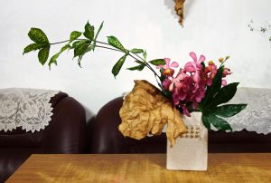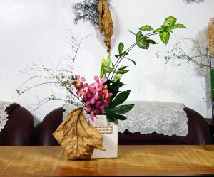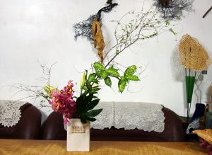 【雪柳星點木共舞】變化式的插法,是我課間習作時常常玩的遊戲;對空間和結構的敏銳,手癢便會胡搞瞎搞一番,或者說,靈感的謬思叩門,當然要開迎迓囉。雪柳是空間感的不二首選,細枒小花,葉嫩而枝條秀勁;星點木雖為葉材,卻異常有個性,有時甚至當作主枝來用,不管拉高線條或剪短成團表現,都很有特色。乾枯的蒲葉,自然扭曲成形,頗有糾結而頑強的生命力。結構的剖析,走圓形和弧形的面向,一盆到三盆,是我心靈空間的遊戲舞曲。 On 2018-01-17