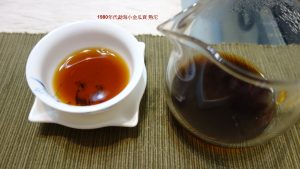 乾茶外形瓜稜小巧,聞之熟香暗浮而潤,開湯後滑潤甘雅,口黏生津從腮下汩汩而出,茶香由樟香轉似仙草帶荷葉的幽遠雅味,這種荷葉或糯米香氣的老茶,通常是老茶骨追尋的雅味之一,因為茶香不顯山不露水,乾淨而厚實的味道,喝的是普洱真金不換的上等茶質。前幾日書房翻閱老藏書,忽見韓愈雜說:「感震電,神變化,水下土,汩陵谷。」恰好為這支茶的茶性演說一二分。緊壓熟茶壓得異常堅緊,雖經30餘年仍無法以手掰開,動用茶刀起茶,陽春嫩尖帶毫顯露,開湯沖沸,鬆開葉脈,僅僅一小杯二口茶,茶氣溫吞發散四肢百骸,厚重而平和開暢,有典型勐海老熟茶的莊重和雅山頭氣,放到冷涼之後有如喝燒仙草般甘潤清甜。這支茶到手約三年,當時初買來時沖瀹暢飲,茶香淡樟,現在更沉穩無奇,膠質醇厚,真有水下土,神變化…..之感嘆!!!