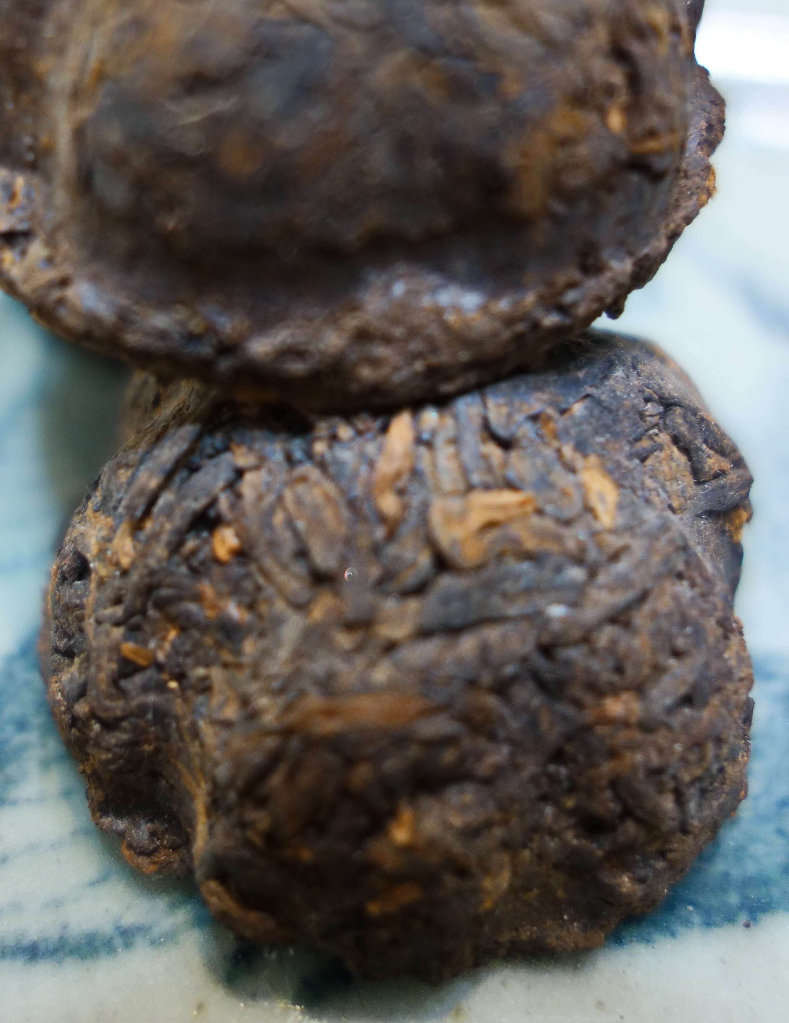 今天的一生一熟哥倆好老沱茶,年份相近,大概是30-38年上下,屬於1980年代的優質好茶,包裝均是小沱凹碗型裸裝(同年代市面上也有些無印無款白竹紙白棉紙包裝),芽毫外顯,條索精壯肥厚但無粗葉,皆是一級二級茶菁壓制。小沱當年壓製大概20g上下,經過陳倉失重,大概16-17g一顆,小巧玲瓏,歲月風霜之後更顯精緻。