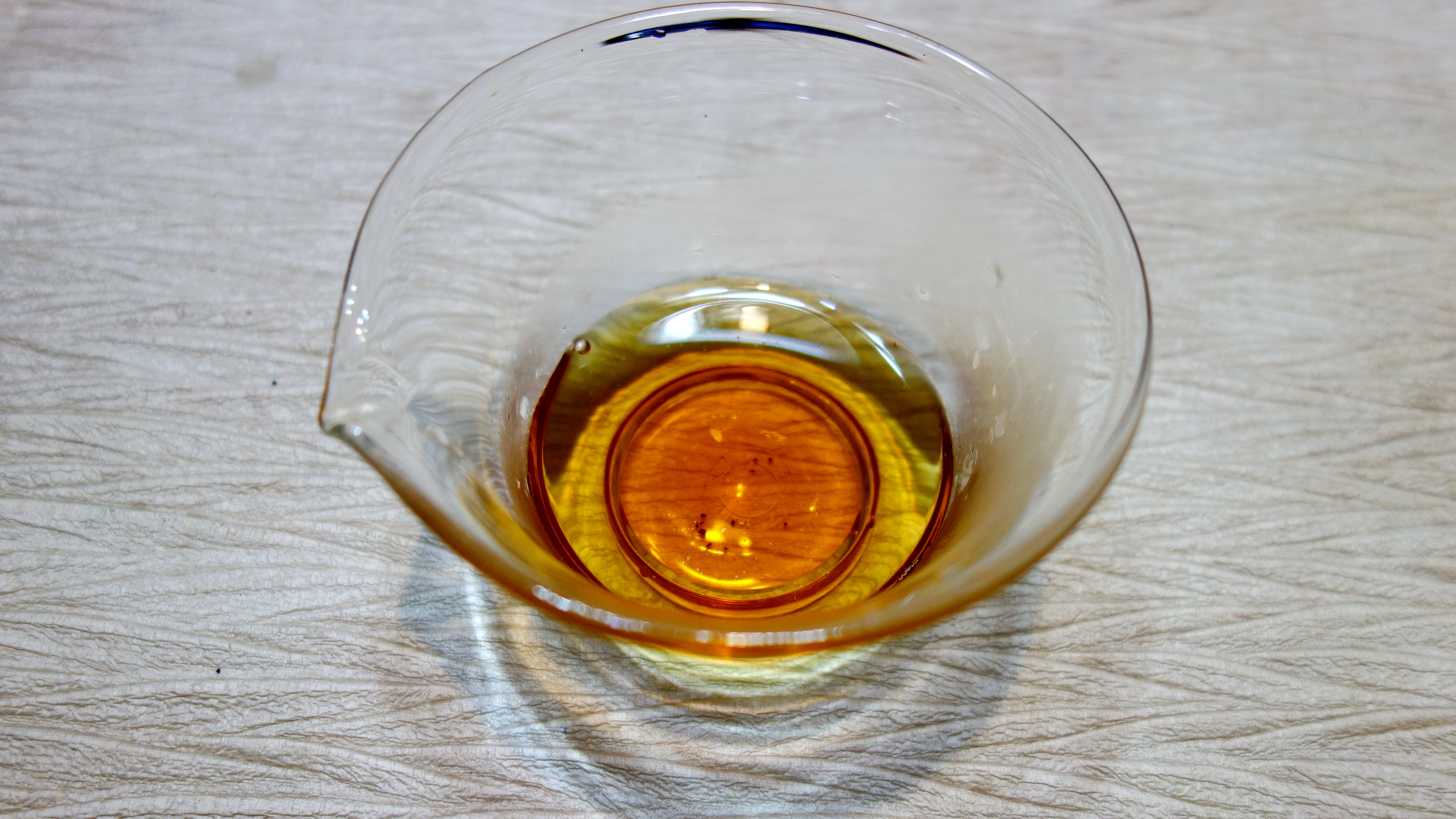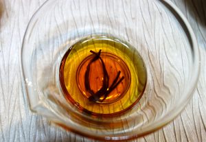 觀滇紅的湯色是一絕,中高溫時湯色通常透亮,從金黃到紅黃到艷紅均有,杯緣金圈明顯,表面起雲,冷後大部分有『冷後渾』的輕微凝脂現象,蓋因茶葉萃取後的油脂、果膠和多酚類交互作用而成。以湯色來看,金針或大金針滇紅芽尖茶色金黃鮮明;金絲滇紅(又稱金絲疙瘩)湯色紅黃透亮;金毫滇紅或毛峰滇紅等,毫量增多,湯色橘豔紅潤;陳化七年以上的滇紅有時由紅轉豔,湯色渾厚有如美人嘴上胭脂,輕嚐一口,色香味俱全,口感妙不可言。