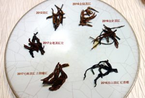 我所蒐藏的滇紅中,有單芽捲成金螺狀的,名之為紅碧螺,為高山滇紅,每年春分前後開採,谷雨前後結束,早春芽毫製成,乾茶蜷曲如蕨類的螺芽般可愛,泡開舒展後可見一芽一葉或一芽二葉有如雀舌般吐露芬芳;也有古樹採摘春芽以曬紅工藝製成(發酵後採用太陽光日曬的方式乾燥),旗槍毫顯,有獨特的蜜香兼蔗糖香;還有茶葉條索成形後,鬆緊適中壓制成沱狀包裝的金毫獅子頭,對於後期發酵轉化滋味更具活性。一級滇紅茶當年製成品茗沖泡,香高味甜,經陳化後,酯類酚類的活性度激發,香氣口感會有明顯的提升。