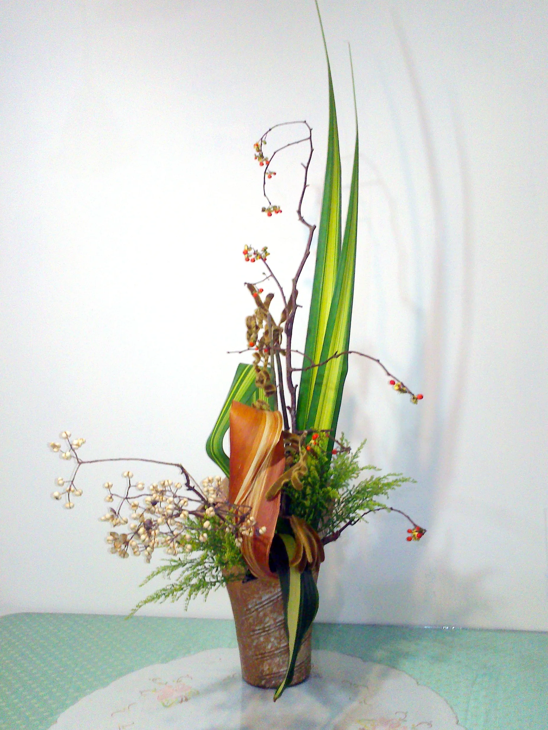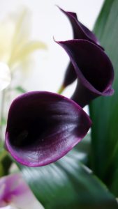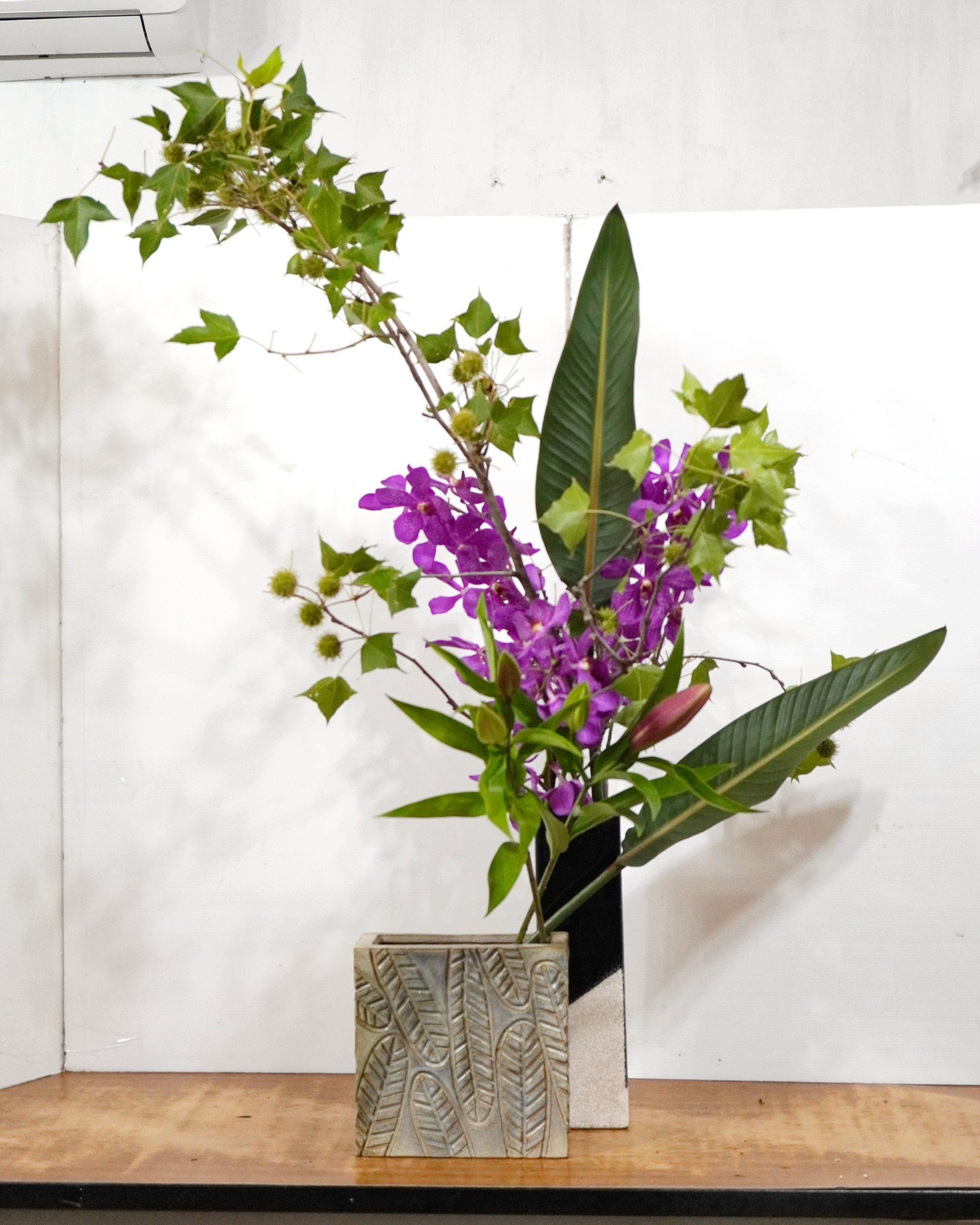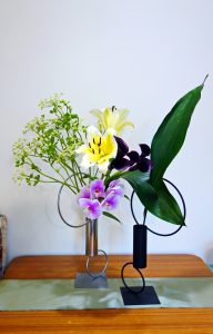 海當歸細碎花序紛紛開且落,有如傘狀的花態,開展形態優美,雙色同款金屬花器以連花型態組合,時尚感簡雅,配花佐以神秘迷濛又高貴的藍紫色海芋,色彩上安定性和深度兼具,以黃色OT百合和粉色蘭花點色增艷,初夏一新花見清爽。