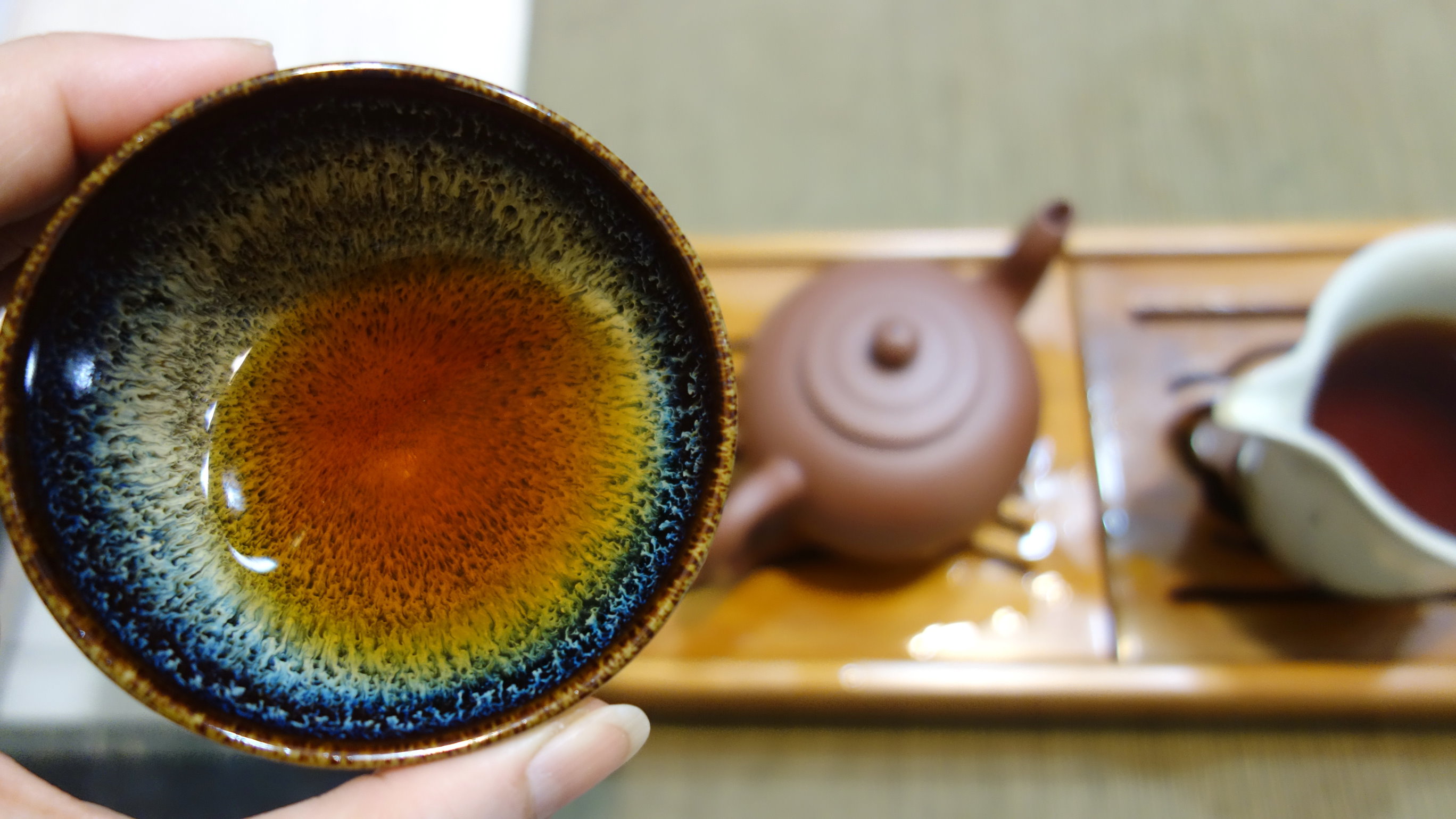【老佛手逍遙丹】80年代的美人肩紫砂壺,泡35歲的台灣老佛手茶,同時代的茶與器。老佛手略醒茶後,開湯韻足,似淡若醇,潤口微澀化甘,褐深赭紅茶湯如向晚的落日,手裡茶甌耀星如百花盞,一甌一口飲得肚腹鼓脹;濕悶晚霾一處無風,白蟻竄飛,殘翅飄零入茶甌,喔……這是初夏的逍遙加味丹嗎?