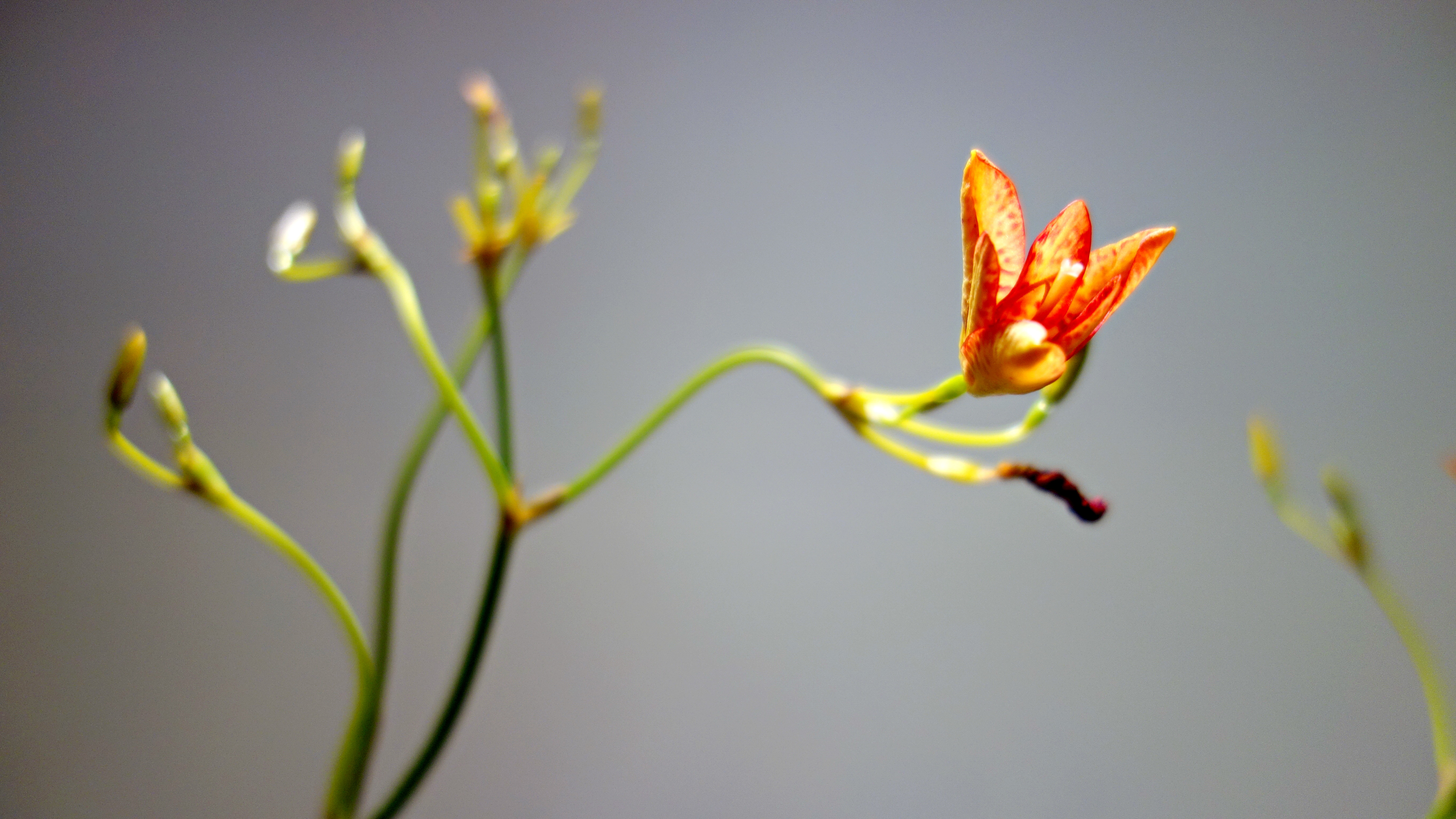 【檜扇戲作涼風引】端午節氣濕悶,一年之中氣短汗虛之時,長養身心輕安,賞花怡情亦能神思靜慮。盛夏插花易蔫萎謝,花鮮芳郁之時保握良辰不負花見;鳳梨花與百合夏季時節相對耐久,課間習作,老師以檜扇來當主角,日間開花,夜間閉合,修長莖幹與小花,看起來很是消暑;檜扇又名射干,是臺灣多年生鳶尾科草本植物,早年日本人初識射干,葉子互生扁平排列,模樣酷似平安時代公家所用的扇子,所以日文名為「檜扇」。射干自古為中原藥用植物,以根莖為用,《本草綱目》:「射干能降火,故古方治喉痹咽痛為要藥。」