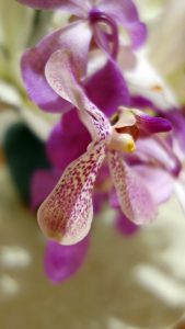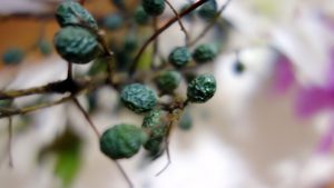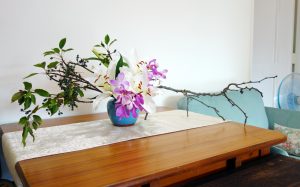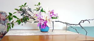【濃綠杜英子 矍枒映花態】杜英子夏日結果,濃蔭夏綠葉果成態,以藍色開片結晶缽甕當花器,原本要插成傾真型態,沒有劍山的交錯花腳,花材順著地心引力慢慢傾斜,乾脆變成平真花形,妝點水晶百合和萬代蘭的繁盛風情;原本想成形的花態偏移了,將錯就錯,找來乾枯的老木一橫放,勢走龍蛇,驁躈矍枒,自有意態,橫看側看都有落點,整體半圓形的態勢也挺有味道的。這種枯老和繁盛相映的花態,很有衝突的美感,也有生滅寂和的動靜節奏。