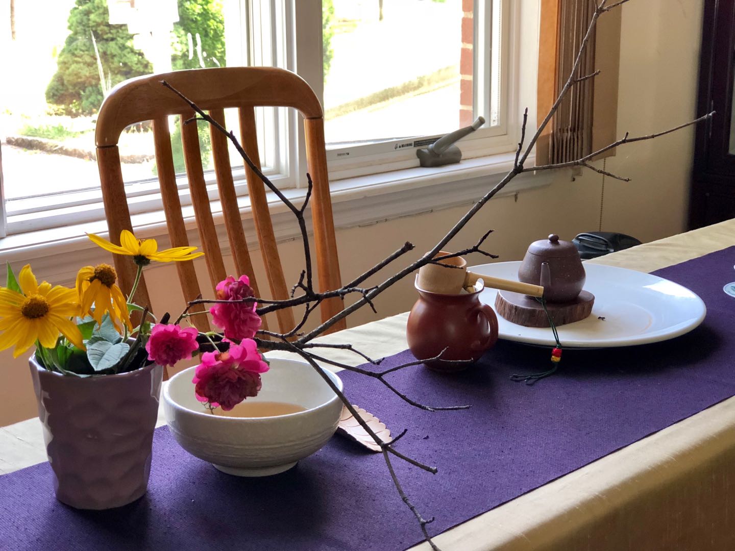 【疏影橫斜拂輕塵】秋分剛過,霜降未至,美東Bayside郊區楓葉乍紅,窗外鳥喧花繁,喝茶圖個定靜安樂;從台灣只帶來少數茶具,茶盤以大瓷盤權充,水方從廚房找出日本碗擱著,庭院摘來薔薇和野菊花,撿拾風掃落枝插成疏影橫斜花見,隨手展演一場秋日午後的自在茶席。
