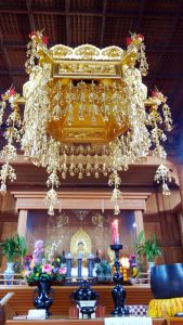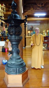 散席後人稀,悟潔法師親自引領我們參觀解說這百年古蹟,臨濟護國禪寺全為木造結構之歇山重簷式,大雄寶殿仍保存完好,建築形式採日本伽藍的仿宋式禪寺格局,內有明治四十五年四月吉辰龍柱及開基佛像,斑痕處處,禪味深深。山門建築屬於日本江戶時期風格,寺前大砥石及寺後開山始祖墓、石雕佛像等極具歷史文物價值。在這幽遠靜深的木造大殿,如若有朝一日能在此敷設雲水茶席供養好茶,當是多麼幸福而感恩啊……,我默默許願著。