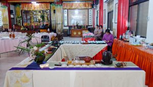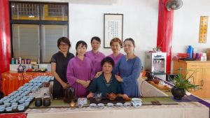 茶席前幾日,我臨時接到好友的邀約,一同設席泡茶供養台日雙方的寺院僧主,是日欣然赴約。好友鳳姊姊自27歲皈依悟潔法師,在淨心長老轄下寺院泡茶供養超過三十載,不管是法會行茶還是僧眾議事,年年月月一路行來,從豐美少婦泡到富泰老嫗,泡茶功夫自然了得,當真是如假包換的《茶頭》(佛家稱禪宗始祖靈前獻茶或煮茶待客之役僧;另,舊時一些地區對茶館中沏茶主事者之稱謂。) 當日清晨佈展茶席還沒完備,台灣這邊的眾多法師因為熟識鳳姊姊多年,還沒八點,早就等喝晨茶了。我們快手快腳展佈兩席並聯茶席,一早就先以好茶供養台灣這邊的眾法師,讓師父們暖暖胃。