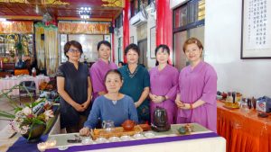 我習茶以來很幸運常有機會在佛門奉茶,開過的公益茶席不知凡幾,百人以上喝茶不算罕見,出湯千杯更是所在多有,一律以紫砂壺一壺一壺現泡出湯,從來沒有以大桶茶充數。因為同師門習茶,也是私交甚篤的茶友,默契和手法可以協同,我和鳳姊姊兩席同開,兩茶人同泡一種茶,茶侶不是同門習茶就是我的學生,茶侶四名分內外場分層負責出湯奉茶,午齋席間供養三種茶,先奉高山烏龍,在奉蜜香烏龍和35年小金瓜貢茶,160人飲三道茶湯,一道茶通常奉上二杯,午齋飲盡千杯茶。