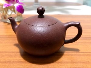帶有梨皮、橘皮的茶壺,以前不算罕見,現在反而難尋。老朱泥調熟砂,或是紫泥調砂,還是練泥40目以下讓礦質自然浮凸的老料,在講究精煉泥料的市場中越來越難尋。手上幾把帶梨皮的朱泥老壺,經歷歲月的吐火褪盡,泥料燥性消融,氣孔擴張填塞茶乳,自然包漿如光華披澤,亞光隱曜而潤澤,手感有如風霜智慧的智者,簡雅大度。
