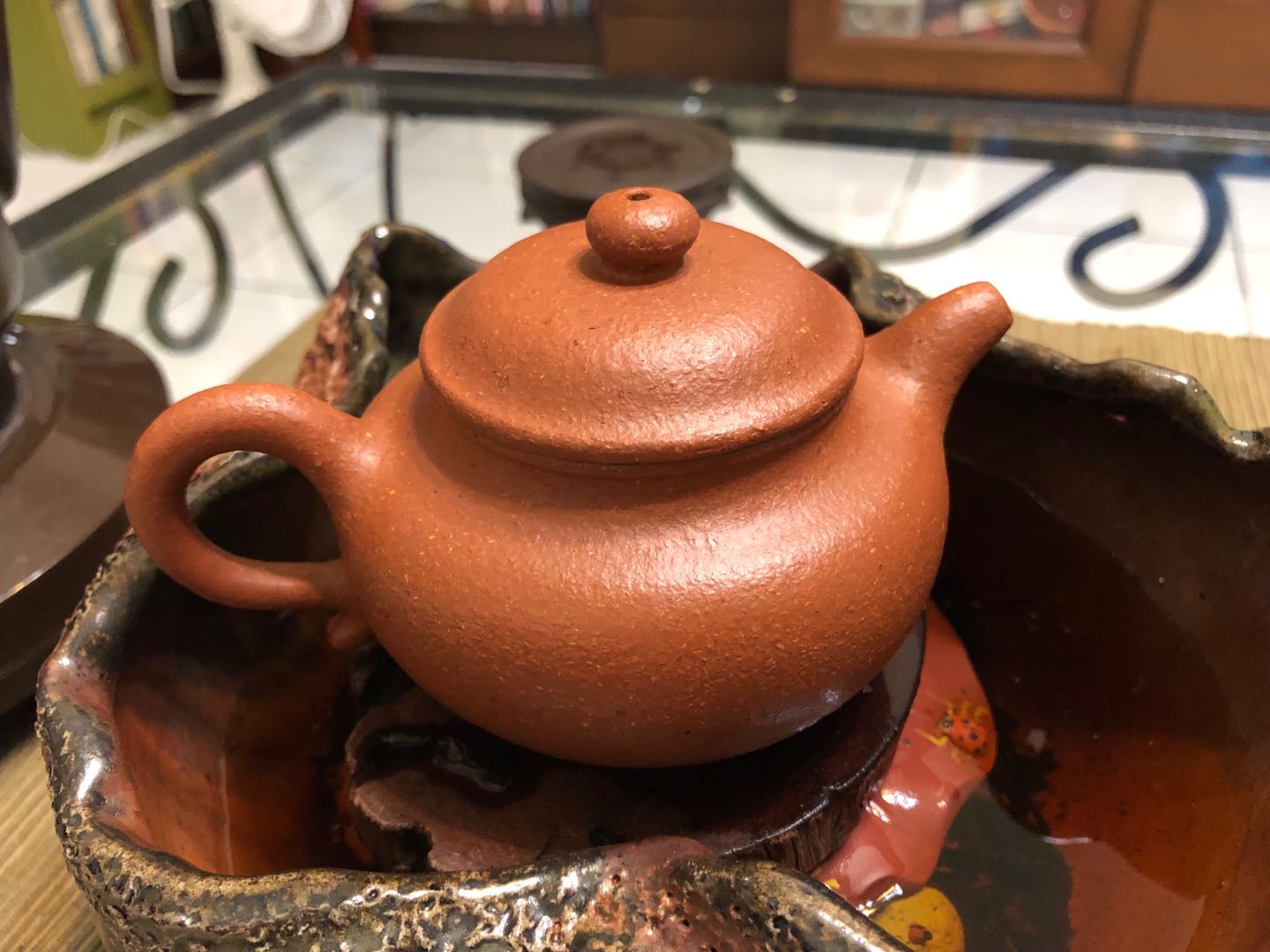 我雖不特別養壺,但是每把鍾愛的好壺,都是精氣神飽滿的豐潤奪目。這把趙夕元老師的降坡泥魚籽泥,簡單得恰到好處,燒透的礦質,誘引茶湯舒展而精萃,我從綠茶、白茶、黃茶、紅茶、老普到高山烏龍,泡茶無一不適用,保溫性高,有些茶種還要略降一二度。尤其初次試壺,就以2009重火鐵觀音來沖盪,甘甜岩骨,喝出不同的茶香,讓我很欣喜。黃龍山原礦的泥料,燒結時融出鐵礦的熔點,分佈在壺底、牆與蓋,自有礦質乾坤的美。