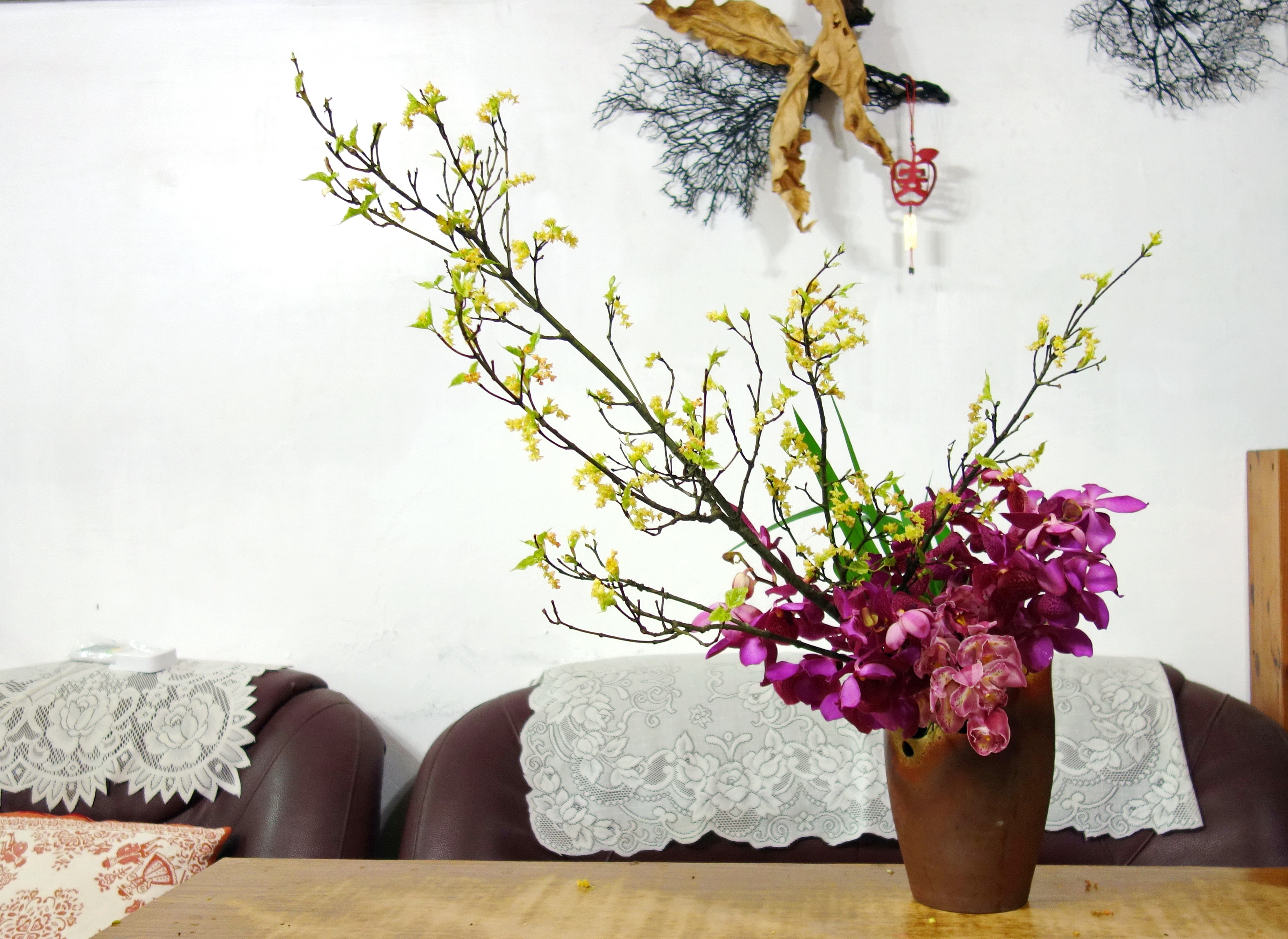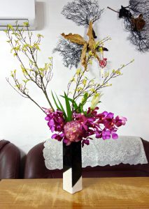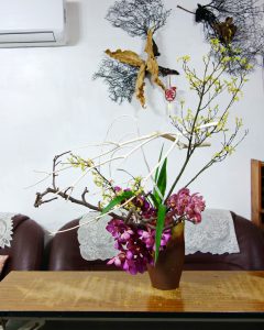【著莪芽葉春潤雨】芽葉新發,萬物欣榮,楓葉芽黃嫩細雅,著莪綠挺。過年前後手感久疏,只有沉靜下來回復基本花形,讓花兒葉兒自己詮釋春天的氣息。課堂間,老師示範拉大空間感(圖二),架上白木的花態,我沉默地看著,當自己狀態不穩定時,老師的引領是最溫暖的情感,安心的跟著學習軌跡前行。