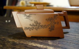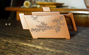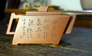 火旺這把壺,開壺時首先試水,250cc的容量,胎體厚實,就手的支點平衡,以女性的手來泡茶,絲毫沒有違和感,可見陶手功學的底子夠扎實;線條和雅、一面刻字《明月松間照 清泉石上流》、一面刻松間月出浮影若現,有文人壺的氣韻,把翫之間,更添風雅,壺型和創意都是坊間少見,可說是一見歡喜的好壺。底槽青泥料純正,『細、潤、嫩、實』兼具,發色帶淺棕色和豬肝紅之間,細潤和雅,略帶亞光油性,茶壺的毛細孔吃水後的滲透性很優異,這是老底槽青的泥料特性之一。壺友追捧的底槽青帶雞眼(若干白色的斑點或斑塊,石英等礦物質團聚物顯現,俗稱“雞眼“)之說,我不太關注,因為這是陶手選料的事,爾等茶人,關心的是茶壺泡茶好不好喝?壺型就手適不適用?泡茶之餘風雅賞玩,天長地久壺潤豐美。壺友常說的一泡潤?這等好壺開壺就潤了……,不是嗎?就美學的鑒賞來說,一把合用的好壺,不僅泥胎純正,窯燒到位,還可見陶手製壺時的心路歷程,包含無數時光積累的功學與美學素養。茶人和陶手的隔空交流,隱性低調,猶如古人詩歌唱和,一來一往不必言詮,自有雅意涓滴細潤,心意相通。