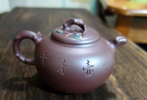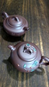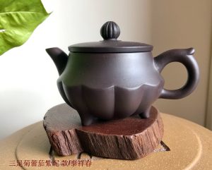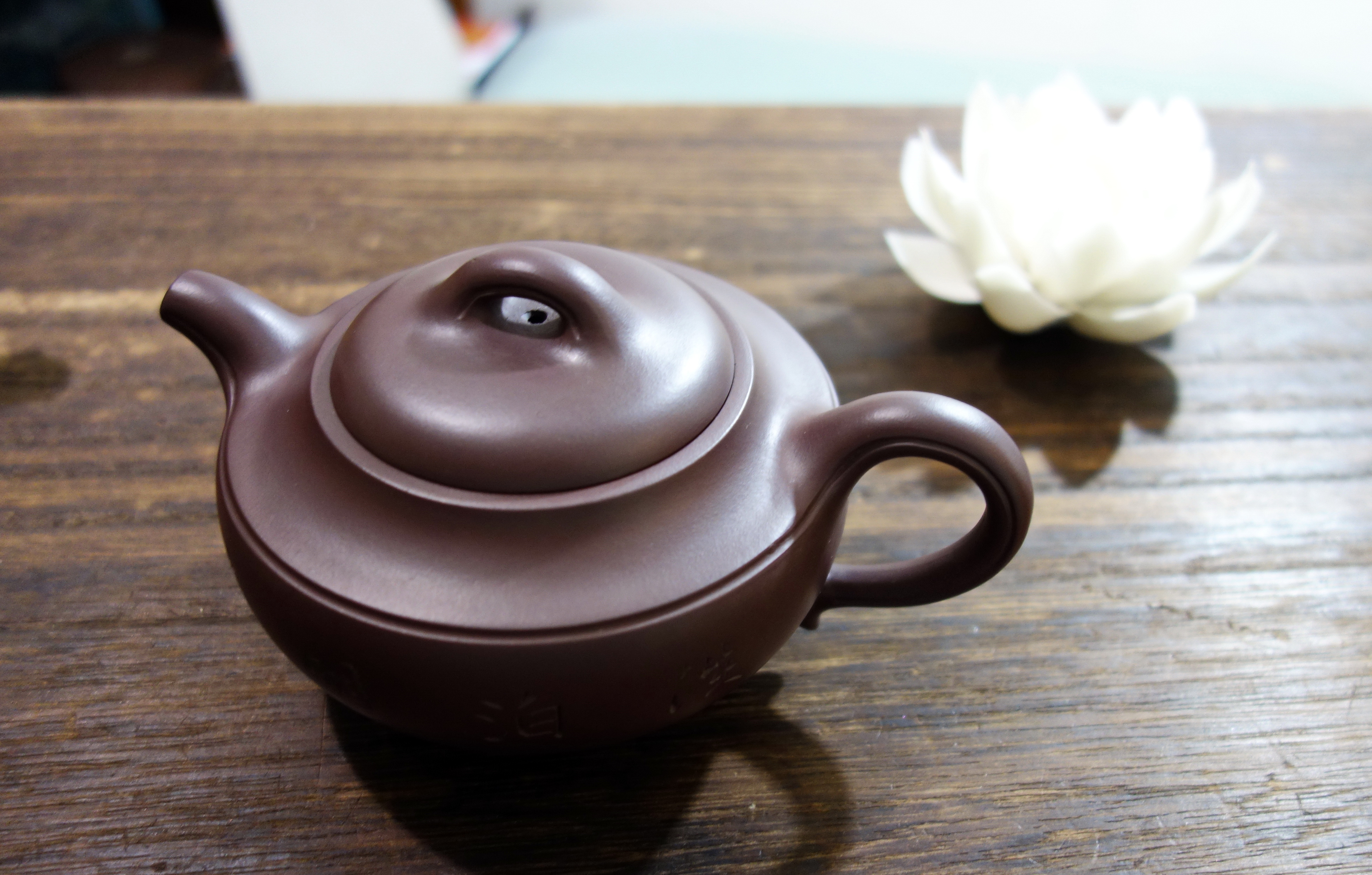手上幾把舊藏的茄紫泥,做工及泥胎均優,藏紫色澤神秘高貴,寶愛異常。舊藏的陳順根老師的《六方雪華》,200cc容量做得胎體輕巧,泡茶下腕重心平衡,整體方圓有度,線條飽滿而簡練,是我很喜歡的一把茶壺。新得沈建康老師的茄紫泥兩把,明針功底深厚,一把《碩果》飽滿得趣,一把《琬玉》靜雅厚實。無論貼花或刻字均到位。琬玉整體沉靜簡雅,身筒肩線尤其漂亮,可惜胎體打得厚,適合男士大手泡茶,對女生泡茶的駕馭,稍嫌厚重,只能叩指落腕來泡茶。丁洪斌老師的《如意鼎》,明針同樣整齊,底足及身筒的比例勻稱,整體光凌靜雅,宜古宜今。另,早年泰祥春一款老款的商品壺,大約是九0年代產制,以前見過沒有蒐藏,多年不見,再得入荷很是開心;茄紫泥胎吐火退盡光澤細緻,底部橘瓣筋紋帶三足的古早味道甚得我心,可惜早年商品壺的出水設計不夠嚴謹,滿水時會從口蓋溢流少許茶水,算是瑕不掩瑜了。