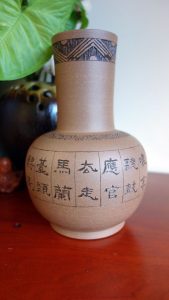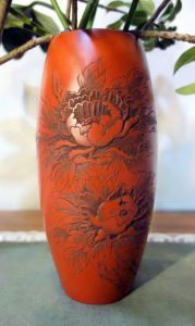 【奔兕砥劍 蒼松凌月】紫砂器作為生活器皿,已經有幾百年歷史,日本人尤其喜歡以紫砂來養蘭花、水仙、松柏,或做為花道的花器。因為養花不爛根,透氣性好使盆內益菌增生。幾年前偶得一個日本回流的橄欖形朱泥花瓶,推測應該是宜興外銷日本雜器,大約有50年歲月,刻繪牡丹艷而不俗,用來插花非常有味道,分享一張舊作,做為同場加映對照。