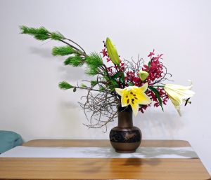 近日偶得一對青段紫砂花瓶,一面刻奔兕砥劍,一面刻篆字,古典器形,氣韻天成;取來乾燥兩年的椰子花,槎棘枒杈和五葉松的蒼翠相得益彰,百合滿室芬郁,在滿月的今晚,遙想奔牛兕劍,意想馳騁,花見自成。