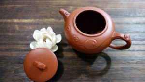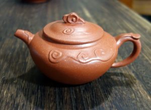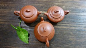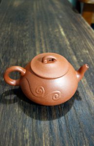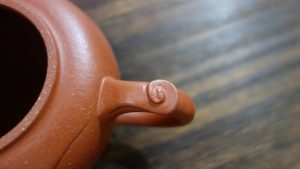 朱美琴老師《行雲流水系列》的龍血砂,呈現魚子般浮凸顆粒,中國紅色溫帶油潤感,觸手摩娑手感綿密,我以岩茶和老生普試茶,表現優異,發茶完美。另一把王梅芳老師提樑壺窯溫更高,帶豬肝暗紅色,表面出現黑星,呈現細潤亞光。