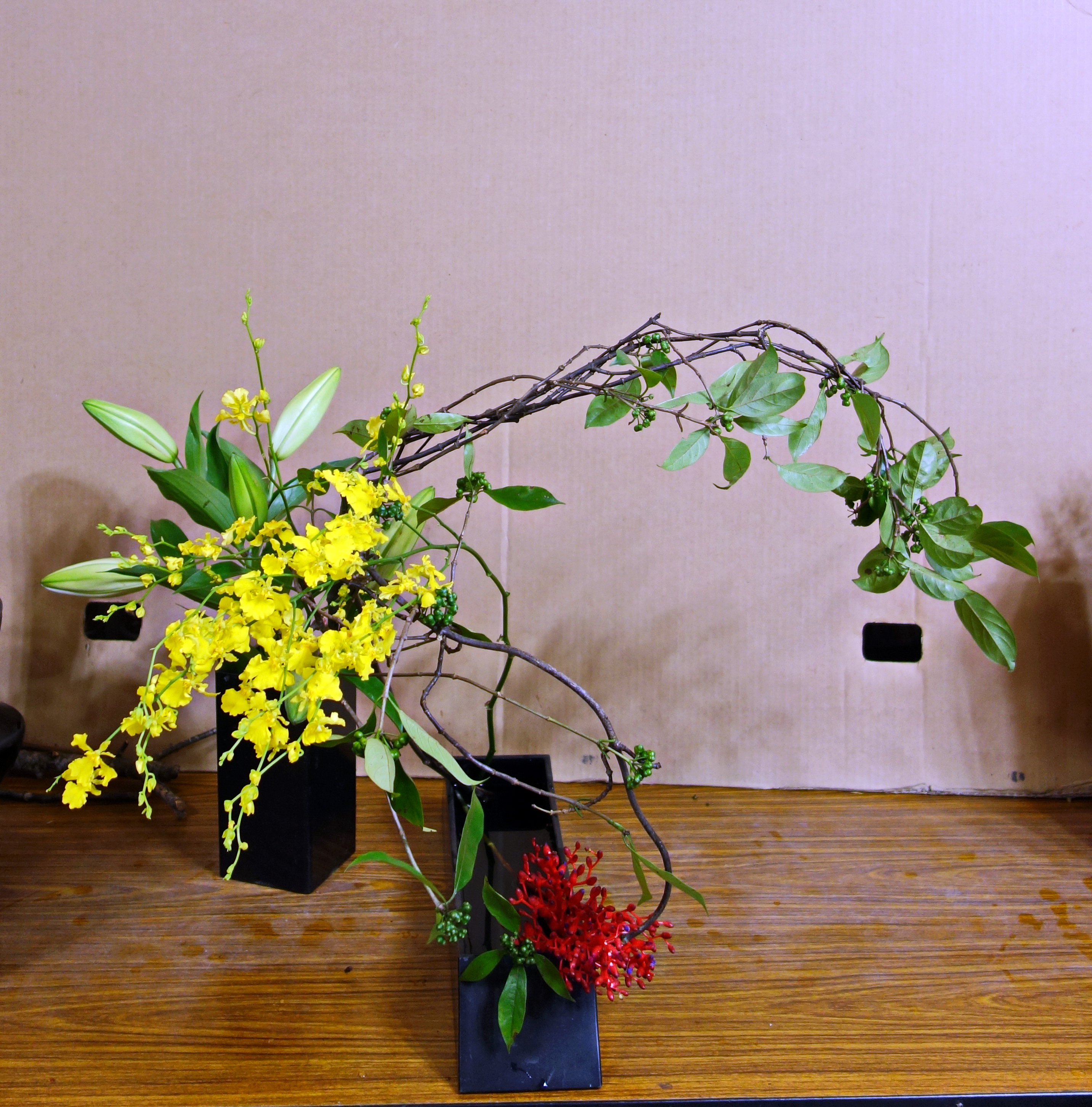 0 min to read 真巡創作花藝 艸禾魚花藝 Posted on 2019-07-21 季夏黑藤子 【季夏黑藤子】雙花器連花,將黑藤子枝條紐股絞纏,果實和綠葉垂墬如風過擺盪,襯著線條延展,搖曳生姿;文心蘭溫暖繽紛的色系,讓盛夏的心情有了喜悅,一小撮紅珊瑚艷麗地豐盛了色彩,也有穩定視覺的感覺;百合含苞,就等花開時滿室馨香了。 By sherrysu