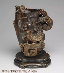 茄楠,又稱伽南、奇藍、琪楠、棋楠等。展件中茄楠珍品,配飾也是精良難得的老坑翡翠、珊瑚珍珠碧璽、加金雕琢或是錫盒篋匣等皆是上選寶石配鑲,蓋因茄楠珍品稀缺價重,比之當時的所有寶石更加珍貴。