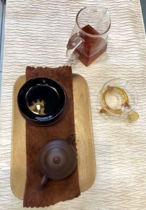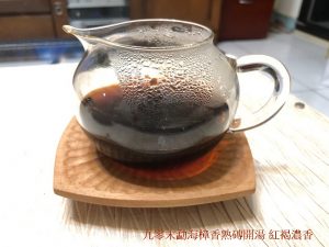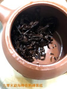 今晚試一款勐海出倉,輾轉幾手的九零末裸磚,鋪面毫芽夾雜,剖開斷面茶葉拚配級數還算整齊,可見是當年中上的茶菁選配,茶乾未泡即聞樟香夾蔘香,開湯沖瀹膏濃紅褐,茶面起雲,甜水滑潤,耐泡耐煮,尾韻甘醇生香,棗香帶樟香,略轉淡淡蔘香,茶氣綿長漫藏,再藏數年可能全轉蔘香或厚甜棗香,存倉算乾淨,略為醒茶即可開湯來喝,惟一美中不足是勐海區重發酵渥堆的手法,對熟碱味敏感挑剔的我,還需要醒茶或再存二年來喝最美,此茶後勢看好,姑且名為『九零末勐海樟香熟磚』。
