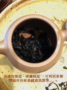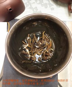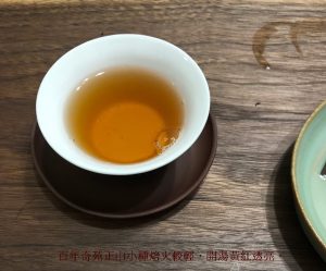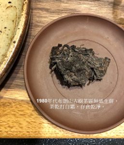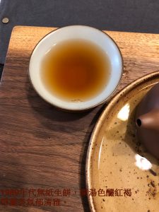 這1980年代無紙生餅,開湯湯色存純淨,茶湯甘潤透亮醇和,首先判別是當年春摘沒錯,初幾口不大顯高低,倒是蘭香帶淡樟香的香型很特別。普洱生茶中要有純淨的蘭香,甚少可得;首先,蘭香或荷香都是淡雅清新的香型,一般不是老茶骨,不必然會喜歡,因為有人喝不出來或者說味寡淡不顯香;二來,蘭香或陳靜典雅的藥香,經驗值上需要乾倉久存才有可能出現。再飲幾道,茶氣綿綿從臟腑引昇,有如綿裡針,氣走臟腑裏而鬆透,身體慢慢發熱舒放;通常老茶茶氣彰顯,有時一口即通氣,這茶怎泡到中段才漫開茶氣走竄?有可能是試茶時身體質素條件不佳,有可能是早年乾倉濕度氣溫太低,茶質轉化低迴婉轉所致…….?吾非仙骨,無法窺探時空陳跡,僅能從經驗判別。再試到12泡,已近子時,不宜再強迫身體覺醒辨茶,否則就是違和養生了。隔日,取泡過殘茶再泡,茶水甘潤甜口,但是茶質不夠厚實,底韻稍加欠缺些些了。