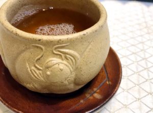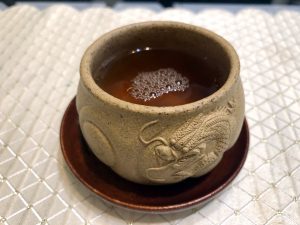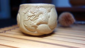 刻繪之餘,在杯子上做文章,除了刀筆大篆的行草楷隸文走龍蛇之象,莫過於精雕細琢的真功夫了。立體雕塑需要扎實的寫真功力,對肌理的掌握和美學的詮釋更要絲絲入扣、生動靈現;麻姑獻桃,如果麻姑變村姑,不是很爆笑嗎?以魚化龍杯來說,魚躍龍門的擬真和傳奇想象缺一不可,總不能刻出一條眼光呆滯的龍、粗笨醜怪的胖魚來充數吧。羅本勇老師的魚化龍杯廣受歡迎,就看其龍牙眦目,龍鱗片甲虛實如生,魚翻騰躍動之姿,盈盈一握,茶香浮沫,一場茶事恍若黃粱一夢,也是一趣。