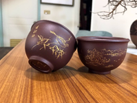 說起刻繪,早期一廠到五廠,甚至廠外生產了無數的小口杯外銷創匯,最常見的梅蘭竹菊小口杯,一邊刻花鳥一邊刻小詩文,簡雅樸拙,再描上白色丙烯或以白泥圖飾,常見紅土、拚紫或老紫泥、老清水等泥胎,窯燒溫度高,用之歷久彌堅,越發樸素而耐看,你家是否也有收藏一組呢?