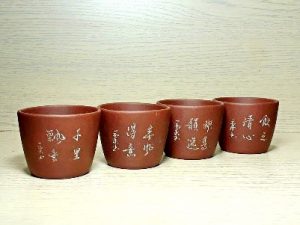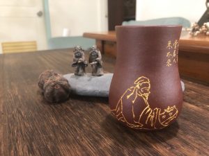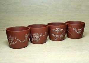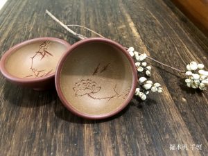 【森羅萬象紫砂杯之五.雕塑刻繪杯】刻繪,在紫砂裝飾技法中應用普遍最常見而深廣,花鳥人物詩文意趣自生,小杯在握,一句雅詩吟哦風雅,呷口好茶,尋常日子的幸福也不過如此。紫砂刻繪分成窯燒前刻、窯燒後刻,竹刀刻、鋼刀刻,破砂刻…..說起來又是一篇專文了,在此按下不表,先欣賞刻繪杯上意趣就好。