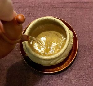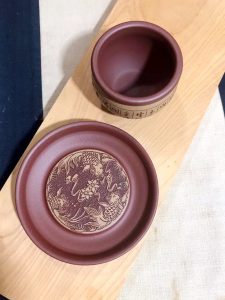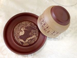 刻繪之外,也會在泥胎上粉漿一層不同泥料,創造層次感,常見紫泥粉老段,紅土粉紫泥,本山綠粉綠泥……..上面再刻繪詩文花鳥,更添雅趣。如圖的松鶴延年、金玉滿堂的粉胎刻繪,喝茶賞詩,也是一樂。