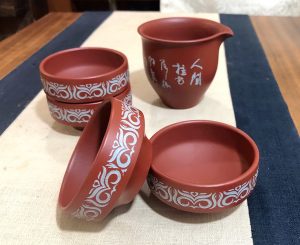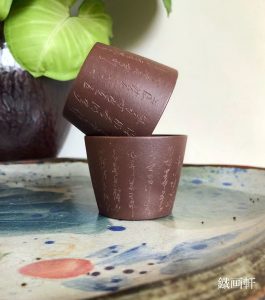 刻繪杯萬象森羅,各種杯體泥胎皆有製作,蒐藏跨度可以從前清、民初、文革、現代…….,各取所好;自古迄今除了民間藝人樸素的刀法,鐵画軒、珍寶齋、金鼎商標…..等皆有產製,我所蒐藏的鐵画軒紫泥小對杯,草書筆走龍蛇,可謂一幅立體詩文作品了;近代也不乏名家大篆的刻功見真章,刀筆協會楊敏老師等多位藏峰而秀的大家作品也是值得蒐藏的。
