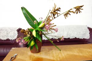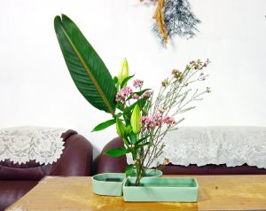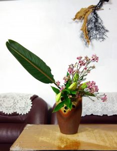 【一葉風華】花藝的練習,型態萬千,大面積葉形,不管是安定型態,還是求取平衡,甚至跳脫束縛直接展現型態各異葉形的特色,葉子的安排,通常讓我苦惱費神。天堂鳥葉不但花形美艷秀麗兼具,葉子也是很棒的花材。 今天習作以天堂鳥葉、蠟梅、毛豆、百合四種搭配不同花器,把葉子位置拉出來惹眼地呈現,葉形風華,我要學習之處還很多。 On 2017-09-20