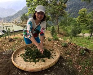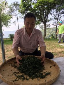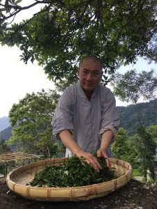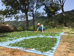採摘,日光萎凋、揉捻、發酵、炒青。以身體眼耳鼻舌身意,意識色聲香味觸,跟著茶葉的微細變化,時時觀色嗅香調整。除了喝茶的禪茶境地,製茶也能體會寧靜舒坦覺受的心識變化,茶的成形是活的,心識的意念也一直在體察之中。茶滋味,就是當下的心滋味。