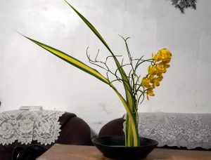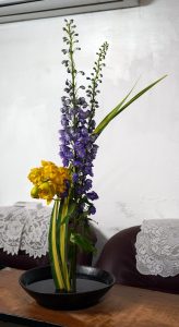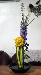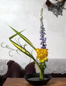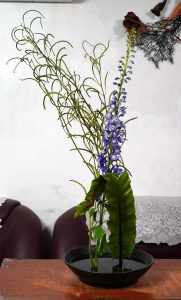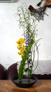 【極簡拂羽–直立花態組曲】挑戰性很高的直立花形,我一直想突破的結構花態。今天老師給的花材也是很難駕馭的類型;飛燕和決明子一上手,嬌弱的紫和四散線條的綠……..小丸子臉上黑線都出現了……。