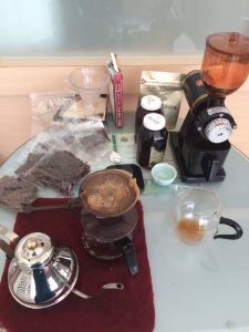 好茶喝得欲罷不能,同學備來豐盛茶點,從午至晚,一口氣喝了七道茶:梅山溪坪烏龍茶+南投貴妃烏龍+西湖雨前龍井+嶗山綠茶(自然農法)+ 嶗山綠茶(野茶)+滇紅+最後以三十年金瓜貢茶(熟普)壓陣,呼呼!中間我還起身沖煮穿插了兩道淺焙咖啡:馬拉威日曬+花神………山川大水,土地豐邑種出的養分,時光歲月流轉32年後,我們還能以茶和咖啡行旅體證世界各地,兼之健康快樂的聚首,情誼不減當年,兩者皆是值得感恩的幸福之事。