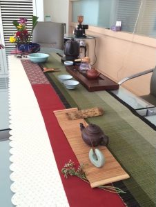 因臨時號召,同學提供工作場地,茶席,在順益汽車接待室以兩桌拼接而成,我將茶席色系妝點豐盛些,因為,這是久別重逢的歡聚時光,怎可能靜謐優雅的喝茶呢?雲水茶席,真心一杯好茶勝過千言萬語,司茶人體察善意,隨順因緣,喝茶人自在歡喜,才得茶境真昧。