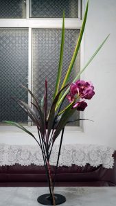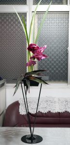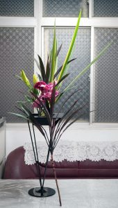 最近偏想練習直立花形,取其結構的力度,課間練習的花材,以高鐵架支腳拉高視覺,其實更難下手。不管了!剪鋏喀嚓,豫則不立,插不好頂多重來而已。