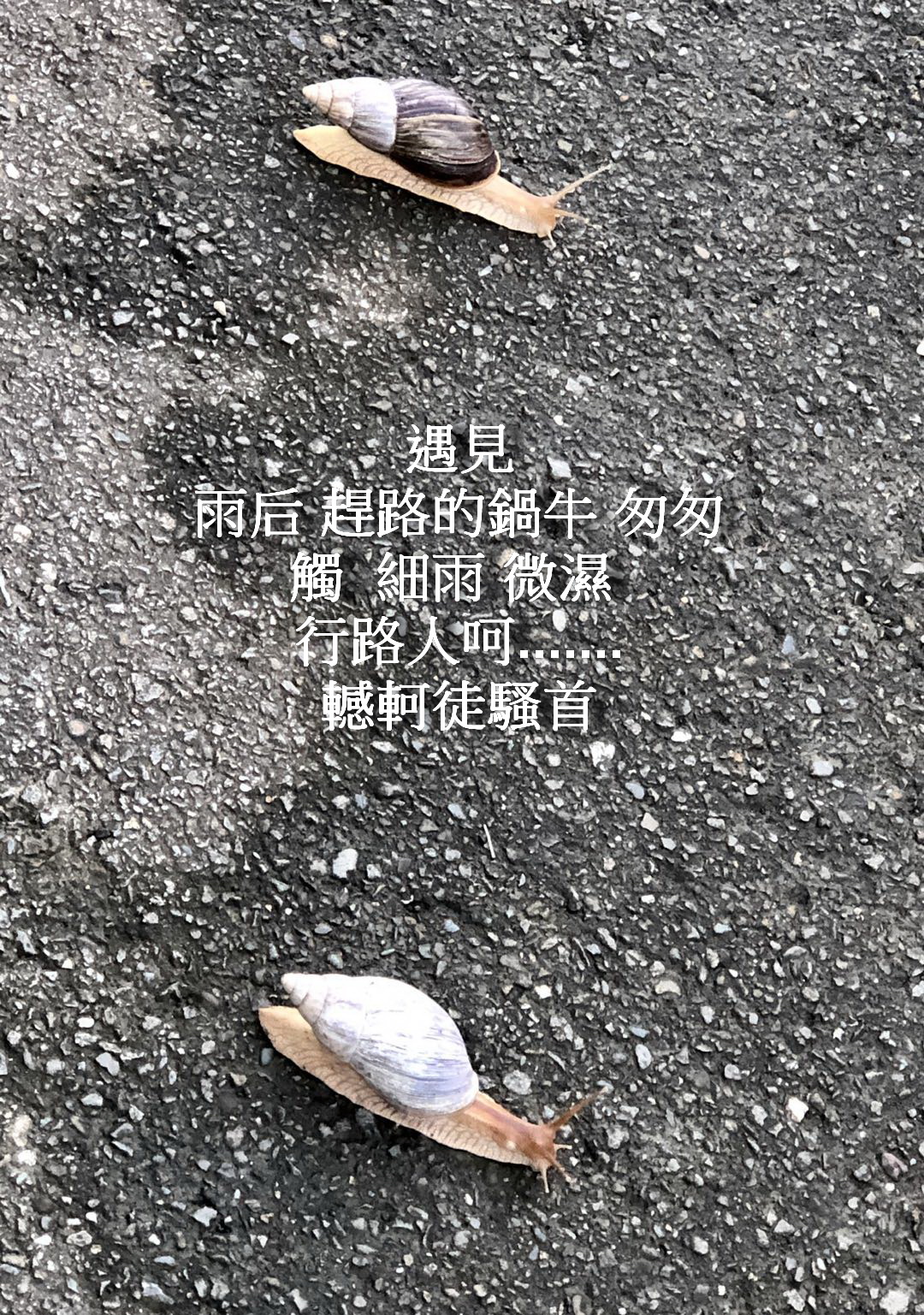 遇見 雨后 趕路的鍋牛 觸 細雨 微濕 行路人呵…… 轗軻徒騷首。
