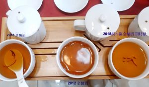 六月間應學員要求,紅茶課開張,除了喝世界四大紅茶,中國十大紅茶當然要喝上幾輪。將家裡的金駿眉茶樣蒐羅出來,一共有5種不同年份和產地的樣本,取三樣以品鑑杯試茶與學習,學員一下子對金駿眉的任督二脈就打通了。品鑑三款茶中,一款正統頂特級桐木關金駿眉,一款明顯是外山茶,一款雖是桐木關但是級數和滋味略遜一籌;比對參數除了茶乾葉級數高低肉眼可見,沖瀹後的滋味所詮釋的特色一覽無遺,還有一般人很難理解的山場氣、種源地,也透過同一時間口舌交叉比對來驗證;三款茶樣之中最頂級的桐木關金駿眉,獨有的品種香–桂圓香與滑潤甜口帶毫香,絲絲入扣的岩韻從齒縫舌顎間泛漾,不旋踵髮際和後背微汗通氣,暖胃通脾,再觀茶色,溫熱時黃橙橘亮,溫度一降略有冷後渾的乳凝狀,冷透後再喝,冷凝香滋味更渾厚甜潤。這支上茶我連喝了幾年,頭兩年還帶有丁香味,茶酚類更明顯,現在轉趨醇和雅潤,醛酯醇酚細微活性轉化完好,桂圓香更顯,好似美人儒雅閒坐,談吐清芬底韻厚實。