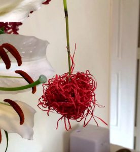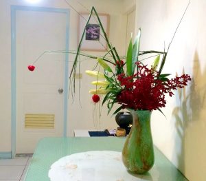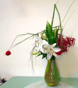 【苜節掛紅絨·喜色翫童趣】天涼好個秋時節將至,花語先解清風。苜節中空,適合型態表現,可以直立取景,也可彎折架構空間感;取來台灣玻璃名家吹製的大花瓶,黃綠流淌有如秋水,時尚當令;當苜節有如骨節伸展,百合花碩大香潔,富士葉箭立,色系與苜節百合相得益彰,萬代蘭簇擁,取細裁紙團成紅絨掛在苜節垂掛前端,喜色童趣感出現了。 On 2015-08-17