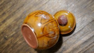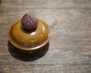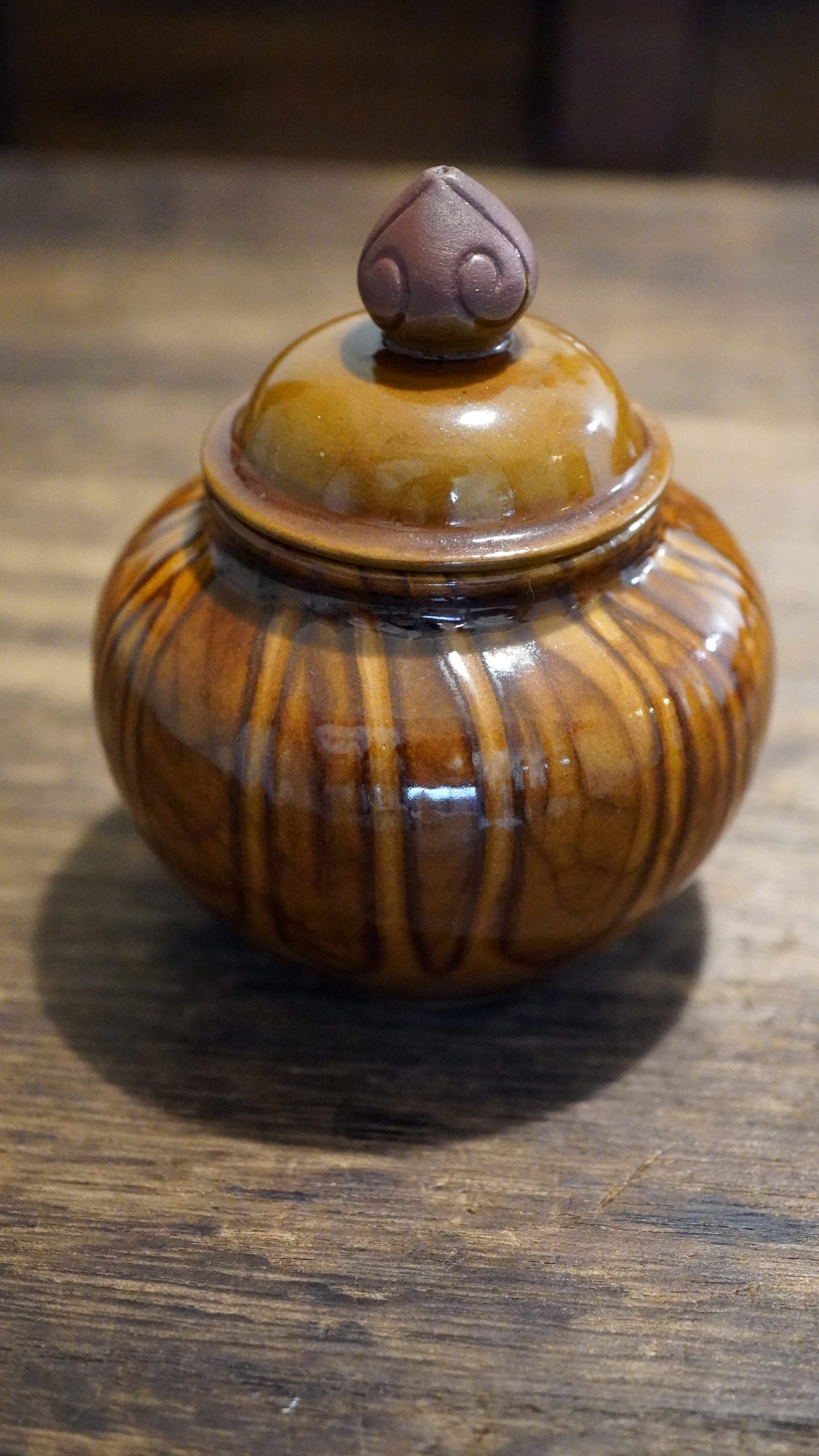 台灣砂土練泥,細綿堅韌,薄胎手製,胎體收腹飽滿而豐美,醬色流釉,高溫燒成,每一個流釉發色略有不同,一時讓我聯想到大唐遺風,壽桃寶珠紐未上釉,方便提取。