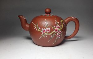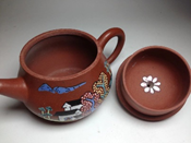 個人最偏愛的加彩朱泥壺,一是產於趙庄帶橘紅色質地細膩的小品,此色類似印泥中朱紅硃磦,發色艷而雅、秀而斂,熱泡時絕色艷美,冷置賞玩時玲瓏朱秀,寶光清鑑,加上點彩的花卉增色,說不盡的風情萬種;另一種是較罕見的梨皮或粗砂朱泥加彩製成的,手工練泥粗砂朱泥在30目以內,坯體製成難度高,以前燒製條件窯溫控制較難,本身就不常見,燒成茶壺又加彩繪又要進紅鍋再低溫燒,使加彩釉著色,失敗率極高,燒成後胎體自有顆粒浮凸的古樸,釉有朱泥艷麗和點色的溫潤細雅,泡茶包漿後別具古典美。