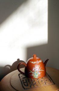 加彩壺的產製大盛於九零年代,現今還有流通的泰半是這時期的茶壺,以朱泥壺為大宗,在時代洪流的淘洗下,花彩斑斕的吉慶趣味,逐漸不受重視。我偏愛加彩壺,有一份對父親懷愛的思念,絲絲入扣的蘭菊彩繪,溫潤典雅,讓我憶起膩著父親喝茶的美好時光,翩翩起舞的秀雅蝴蝶,停駐在朱泥艷色的小巧的壺身,就像春日午後的烏龍茶,永遠馨香雋永。
