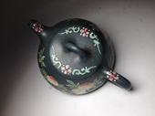 早年港澳台受閩南、潮汕喝茶風氣趨向所致,偏向小品小茗酌,茶壺的容量以120cc-200cc之間居多,不像現在宜興製壺風氣偏向250cc-350cc的品項;加彩壺也以朱泥料為大宗,幾乎占了九成以上產量,次為紫砂,再次為以紫砂為底料淋漿、粉漿綠泥、天青泥或者本山綠(或段泥)…..的取向;我所蒐羅的加彩壺大約20把,算不上檔次,緣起於少時跟著父親喝茶,家裏也有幾把質精細雅加彩壺,懷舊與思念父親與啟蒙我的茶緣,隨緣蒐羅一二,個人偏好趣味而已。