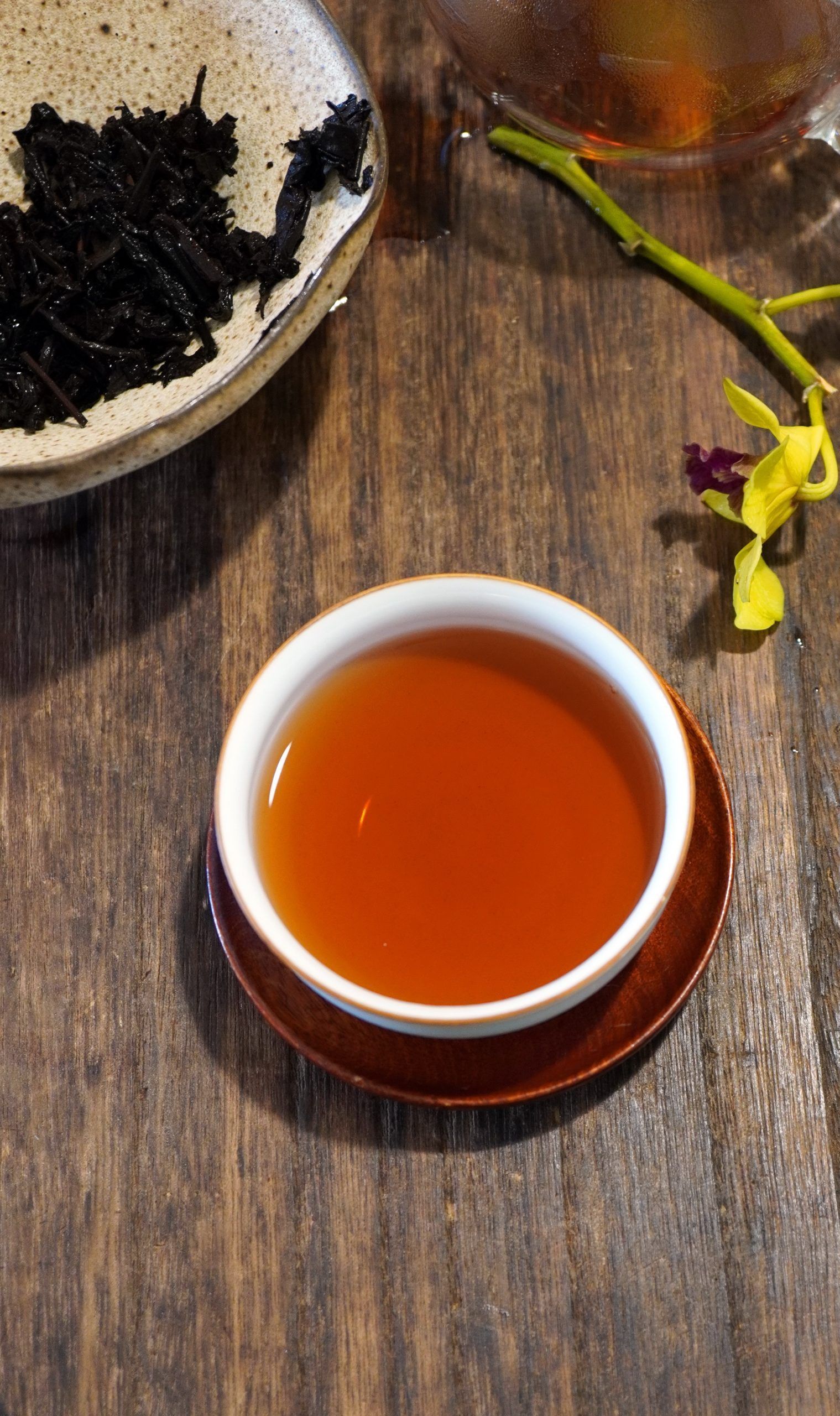 茶湯純淨透亮,以棗香揉和蘭香為主,甜潤滑順,一口生津,是不可多得的老生普磚;茶氣勁透蒼古,耐泡遠韻,可見有相當含量的早春芽頭與野生古樹配比,由當年勐海茶廠革命委員會產製,也是老生普品質驗證之一。原500g,自然失重現重425g。