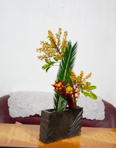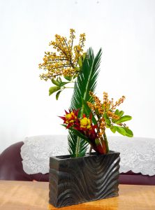 這盆命名為秀挺若翊的花見,畫龍點睛之筆在於鐵樹葉的位置,濃綠如鳳羽挺秀。寫這篇發文的時候,忽然憶想起父親,在窘迫年歲日復一日 何以寄託……?以花藝來潤澤百般艱難的人生,原來就像沙漠甘泉般豐美啊!