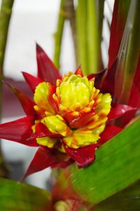 鵝掌果纍纍碩果,鐵樹葉修然如羽翼,配上金鑽鳳梨的塔序狀花果,鳳呈祥瑞感油然而生。中國的色系瑰麗多彩,層次分明又豐滿祥瑞,由大量的互補色、對比色雜揉交織,大花滿色的戲服與宮廷祥瑞的冠服,抑或神佛衣幔纓絡滿翠的莊嚴,皆在展演人世間華貴的祝願!少時矯情,偏好黑灰淺的文青色系,許是歲月風霜的歷練,教會了無事一身輕、豐足無憂是多麼難得幸福,看著廟宇華貴的錦繡華色,不禁有欣然愉悅之嘆,噫吁!歲月的厚度,果真要千錘百鍊的風霜雨雪來將就啊……!